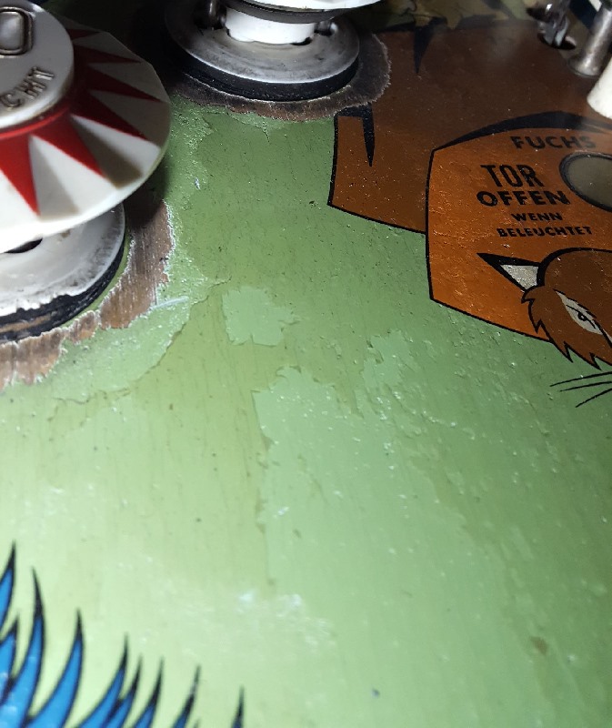 Ik ben begonnen met het te verwijderen met magic eraser, mogelijks haal ik dan alle bescherming weg, maar ik zou het eerst toch egaal glad willen krijgen, dan retoucheren en dan eventueel een playfield protector erop.
