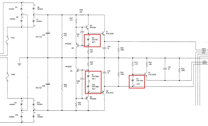 De Zener-diode (ga af op de kleur) die vlak bij Q7 zit heeft een spanning van -103,2. weet echter niet of die D3 is maar is de enige als ik afga op de kleur die dicht bij Q7 ligt.