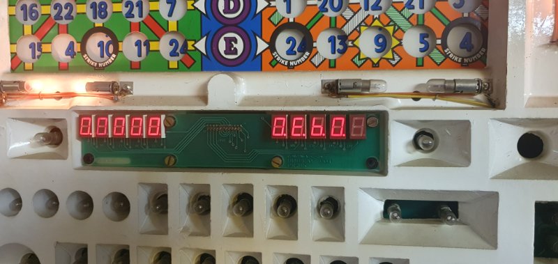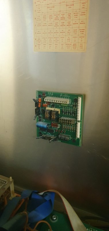 Na het openen van de bingo en het loskoppelen van het speelveld veranderde de bovenste code naar 0Eb0* en de onderste naar 0code F (zie foto's). Bij het aanschakelen van de dipswitch H1 (dient denk ik voor het testen van de Eprom) veranderden de linker score display naar 0A1bF, rechter display naar 0807*. Bij het openen zag ik ook dat er wat kabels losgemaakt waren van een board in het backpanel (zie foto's). Het probleem is dat ik geen manuel vind van dit model en geen service box heb. Ik vond online wel iets dat de code 0Eb0* iets te maken heeft met een elektronische key maar daar weet ik niet veel van dus hoop dat iemand mij hierbij kan helpen.