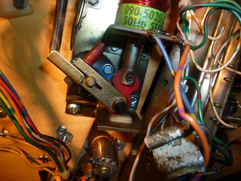 Dan, niet gehinderd door enige kennis van zaken whatsoever onder het speelveld gekeken. Gelukkig staan er verschillende van die dingen op zo'n flipper, dus kon ik goed vergelijken, en daarmee de dader gevonden: Het rood plastiekske was snel er terug ingeduwd, maar blijft dit zitten? Met het vergelijken met de rechterflipper zag ik toch wel een verschil. En inderdaad, na 1x flipperen was dat spel terug los. Provisior proberen te fixen met een nagelke bleef wat langer ok, maar toch snel terug los.