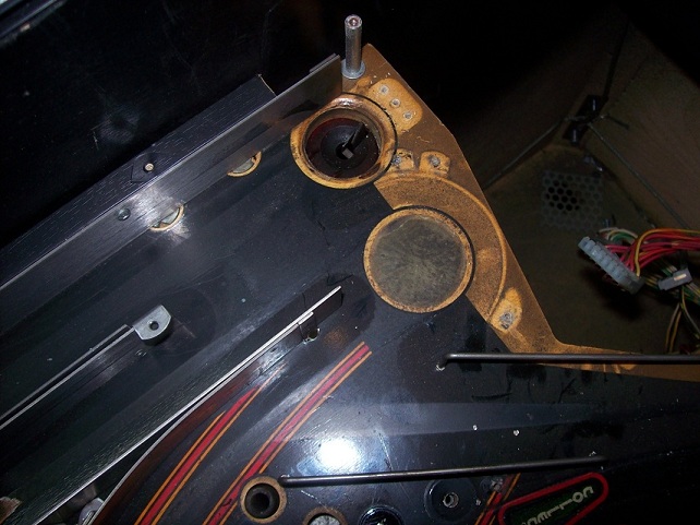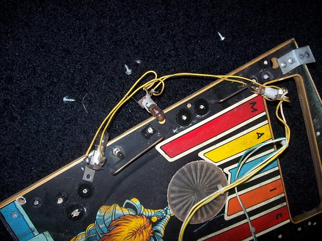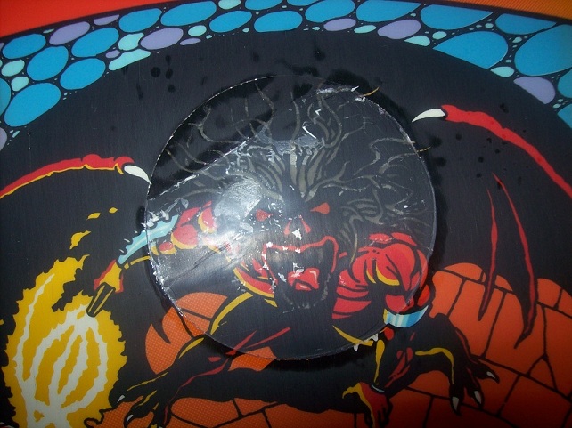Je ziet dat sommige inserts volledig weg zijn, bellen onder het mylar en vooral links op het speelveld grote schade.
