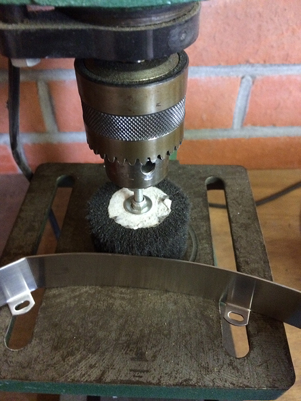 - eerst met zo'n staalborstel op de boor, met de richting van de geborstelde inox mee. Op die manier maak je weer fijne groeven op de plaatsen die vlak en blinkend gepolierd zijn geworden door de bal.