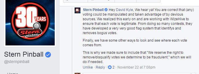 bericht via fb gestuurd, maar kreeg zo'n standaard bericht terug... de meeste votes komen dan nog erbij terwijl het in amerika al na 12u 's nachts isDavid Pinball Wizz schreef:pff jammer dat het weer zo gaat. Zou Stern er toch es over aanspreken hoor.