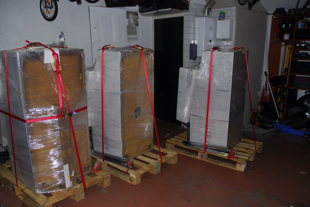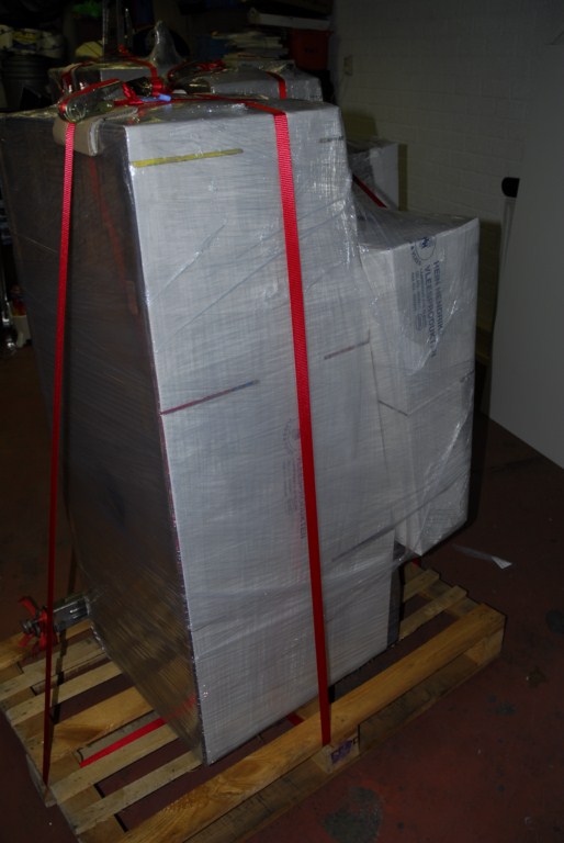 dan op de palet zetten, 2 kruislings geplaatste spanbanden erom en bijna klaar