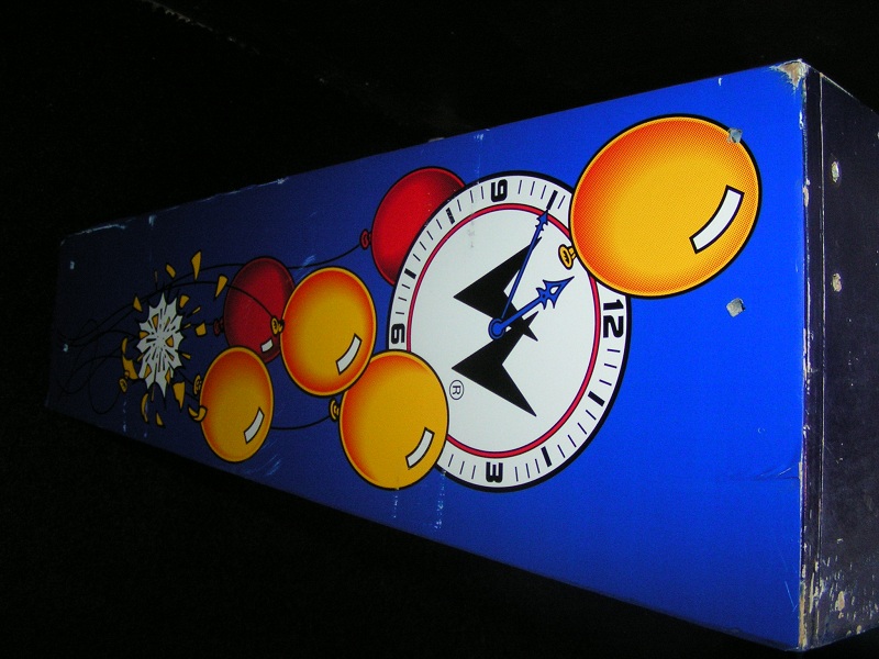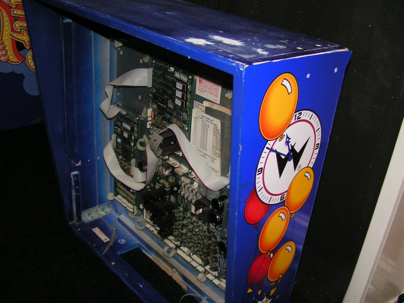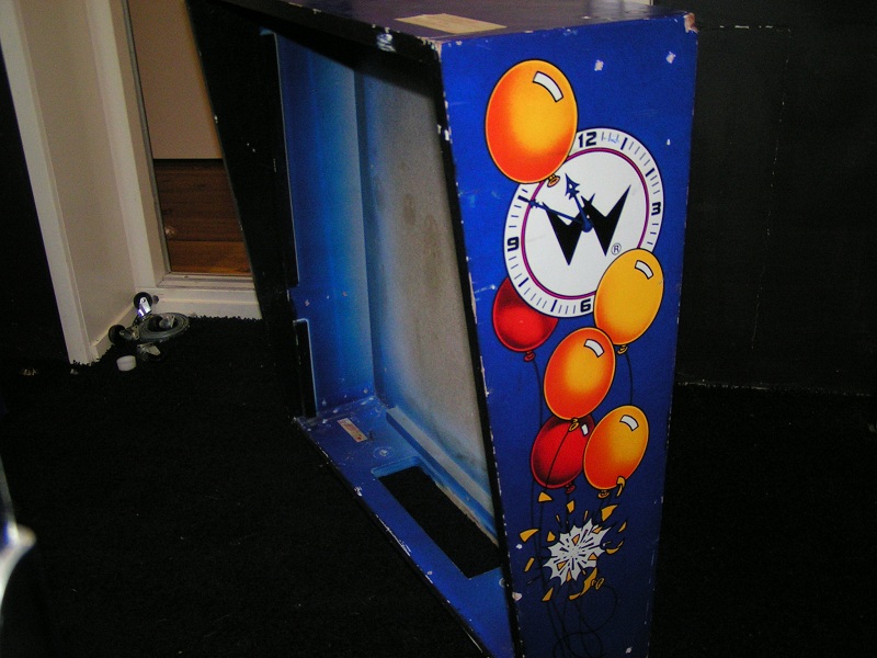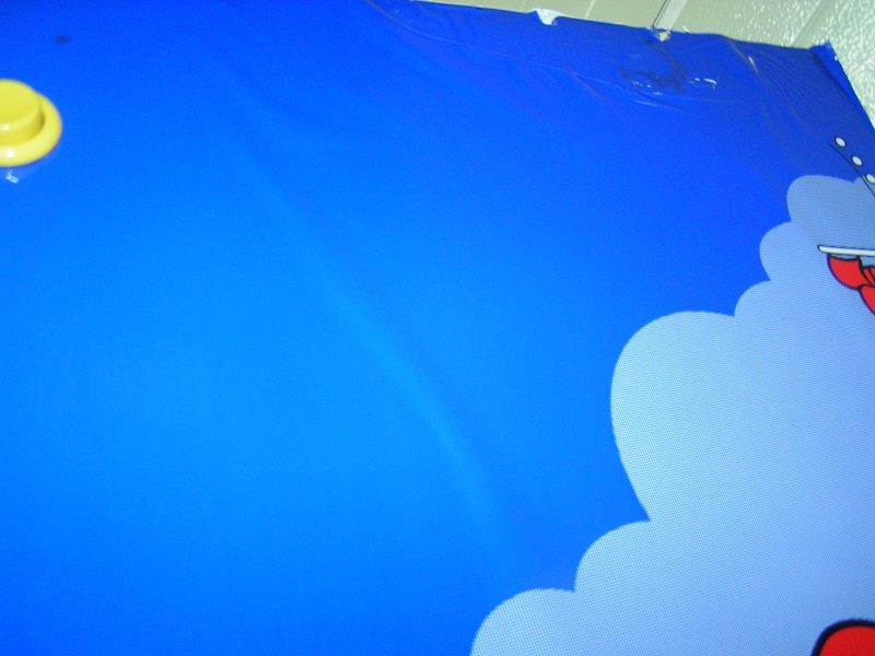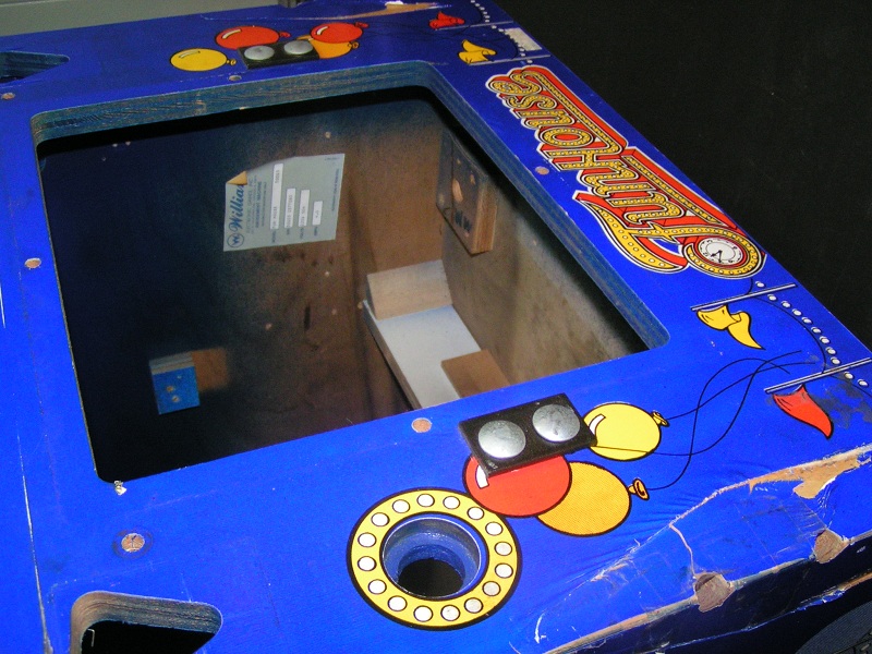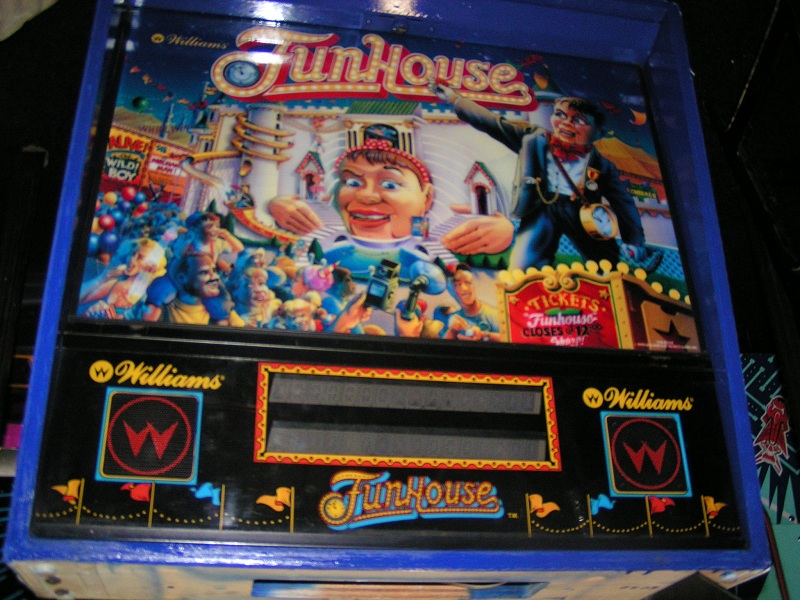Ooit is deze Funhouse voorzien van nieuwe bestickering. Maar dat is niet zo goed gedaan en dat laat overal los, kreukt en is beschadigd. De eigenaar heeft zodoende een ander cabinet geregeld, die iets verkleurd is, maar overall in wat betere staat als het bestickerde cabinet.