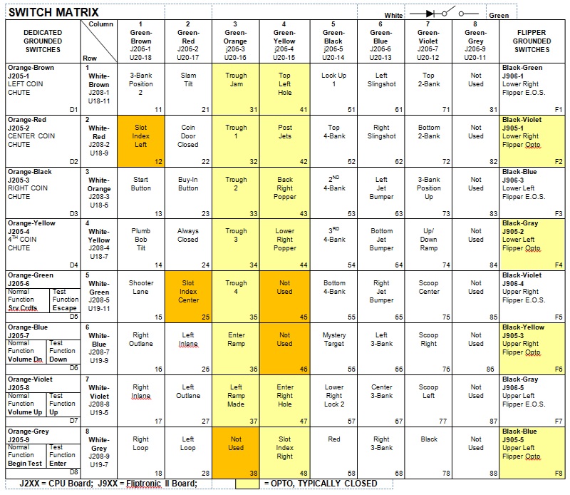 De donkerder geel gemaakte switchen in de matrix zijn de vraagtekens.