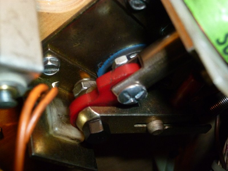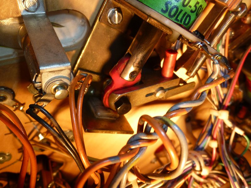 Dan, niet gehinderd door enige kennis van zaken whatsoever onder het speelveld gekeken. Gelukkig staan er verschillende van die dingen op zo'n flipper, dus kon ik goed vergelijken, en daarmee de dader gevonden: Het rood plastiekske was snel er terug ingeduwd, maar blijft dit zitten? Met het vergelijken met de rechterflipper zag ik toch wel een verschil. En inderdaad, na 1x flipperen was dat spel terug los. Provisior proberen te fixen met een nagelke bleef wat langer ok, maar toch snel terug los.