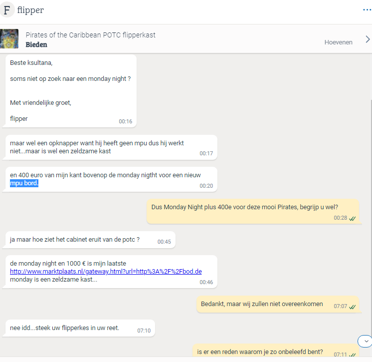 Plus, een week later heeft een andere Duitser een andere flipper komen ophalen en die zei dat ik daar niet zwaar aan moest tillen. Hij heeft in betreffende topic van die andere Duitser mij wel als correct omschreven maar die kreeg daar ook de volle lading voor dat ik die omgekocht had of zoiets... Pfff...