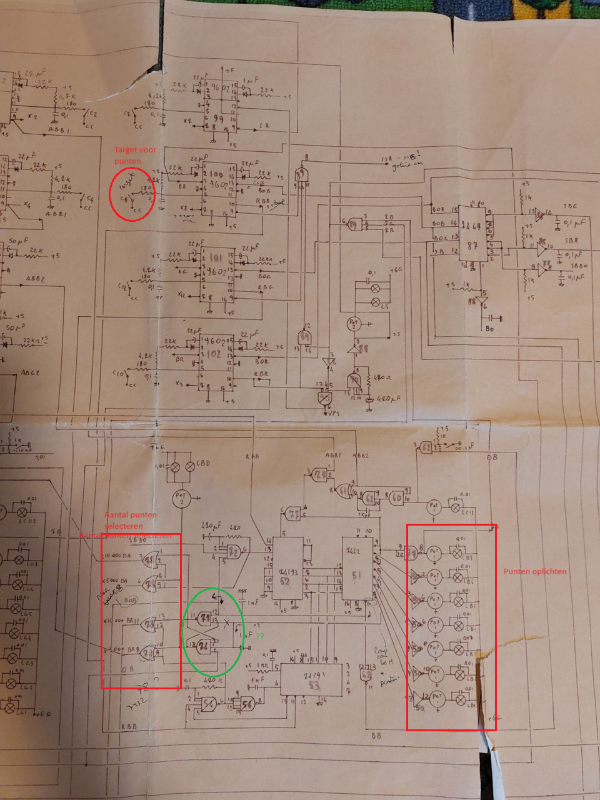 Ik verdenk nu de groene omcirkelde schakeling (zie schema: IC77 en 74 = NAND poort), maar geen specifieke reden hiervoor. Ik veronderstel dat deze het aantal punten selecteert. Maar het lijkt wel dat alle mogelijke scores tegelijk worden bijgeteld misschien?