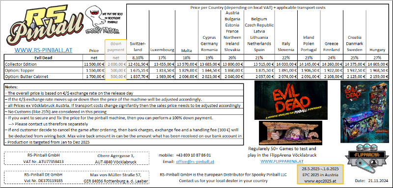 Volgens de website van Spooky is RS Pinball (Oostenrijk) de Europese verdeler. En dit zijn hun tarieven :