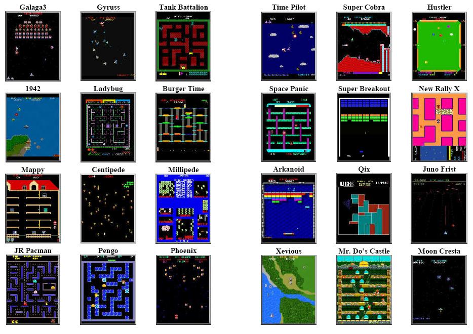 Ms Pac-Man / Galaga / Frogger /Donkey Kong / Donkey Junior / Donkey Kong 3 Galaxian / Dig Dug / Crush Roller / Mr. Do / Space Invaders / Pac Man Galaga 3 / Gyruss / Tank Battalion / 1942 / Lady Bug / Burger Time Mappy / Centipede / Millipede / JR Pacman / Pengo / Phoenix Time Pilot / Super Cobra / Hustler / Space Panic / Super Breakout / New Rally X Arkanoid / Qix / Juno First / Xevious / Mr. Do's Castle / Moon Cresta Pinball Action / Scramble / Super Pacman / Bomb Jack / Shao-Lin's Road / King & Balloon 1943 / Van-Van Car / Pacman Plus / Dig Dug 2 / Amidar / Zaxxon