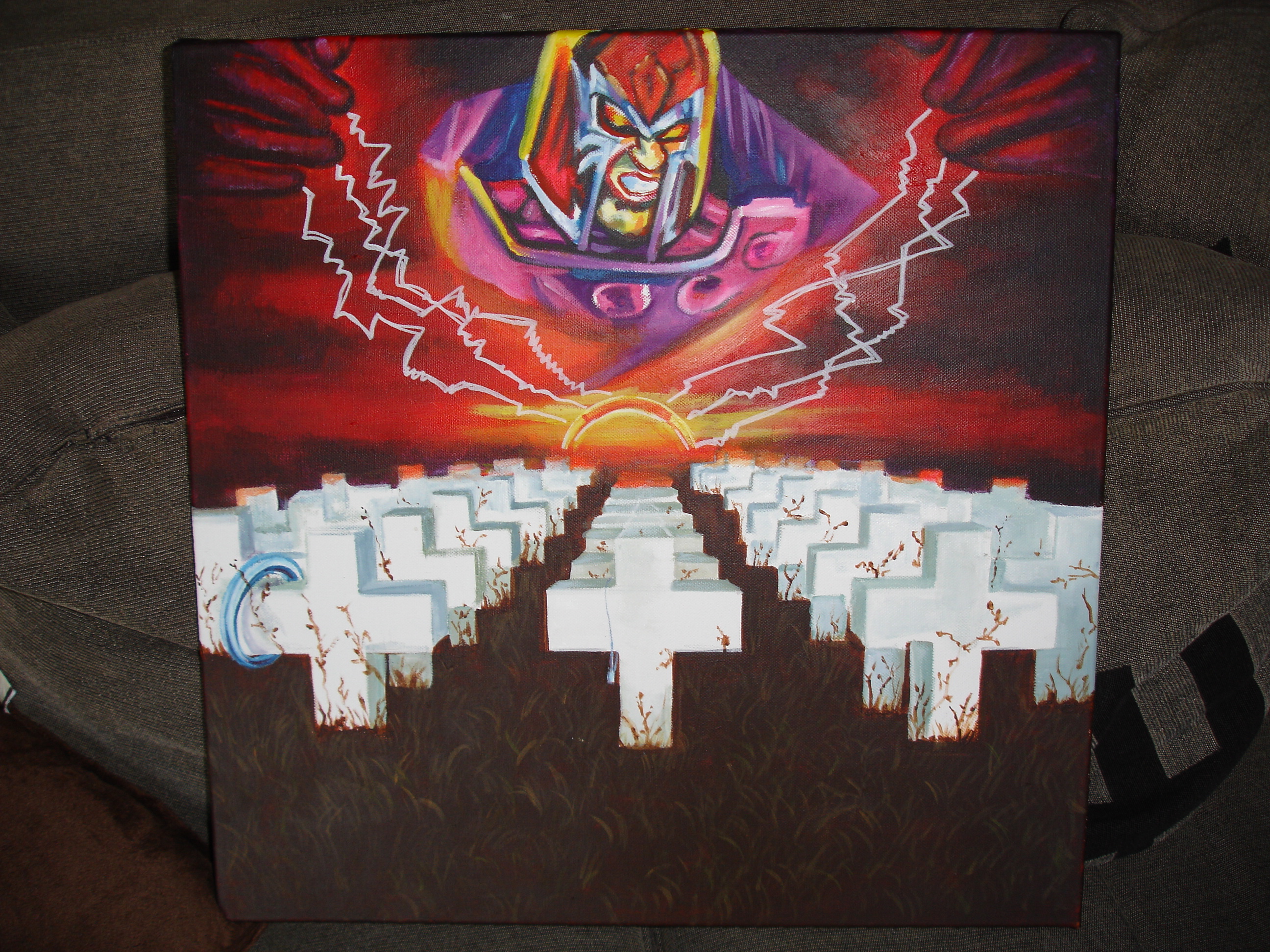 Recent vroeg ik haar om een schilderijtje te maken met als thema een mix van Tron, Magneto en Master of Puppets (naar de Borg-flippers uiteraard) en het is dit geworden :