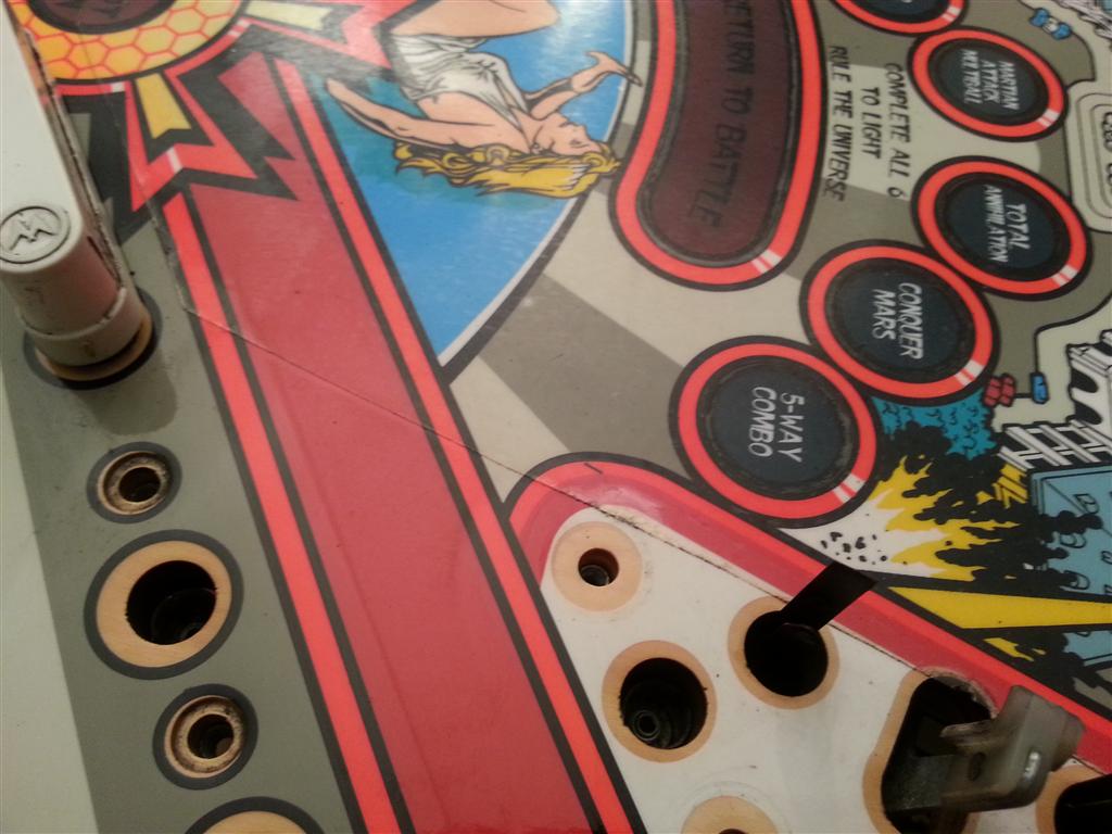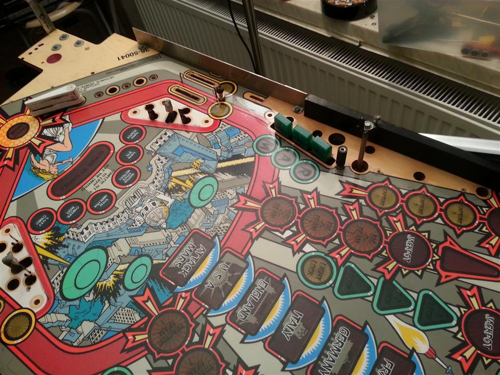 Geclearcoat en enorm fluoriserend! Als ik kijk naar jouw veld dan valt mij direct het vervaagde groen op van de vliegende schotels (mid playfield), daarnaast het verminderde fluor geel/groen/oranje/rood rondom diverse inserts. Als je dat wilt laten herstellen (laat staan zelf verbeteren) dan kun je je borst reeds nat maken. Want dat is monnikenwerk (zie de geweldige verslagen van Pascal)!!! Zoals gezegd heb ik nog geen slechte repro gezien! Alle AFM repros zijn afkomstig uit Duitsland (niet HSA uit the US of A). Ik zou als je dan toch de hele kast uit elkaar trekt zeker het speelveld dmv een repro vervangen, als John nog 300,- voor je oude veld over heeft, is je extra investering 550,- en dan heb je blijkbaar iets perfects maar als ik het goed gezien heb ook wat speciaals. Die repro op Marktplaats betreft een PROTOTYPE speelveld. Daar zijn er slechts 20 van gemaakt. Het verschil betreft de rule the universe en lock inserts, deze hebben een andere kleur.